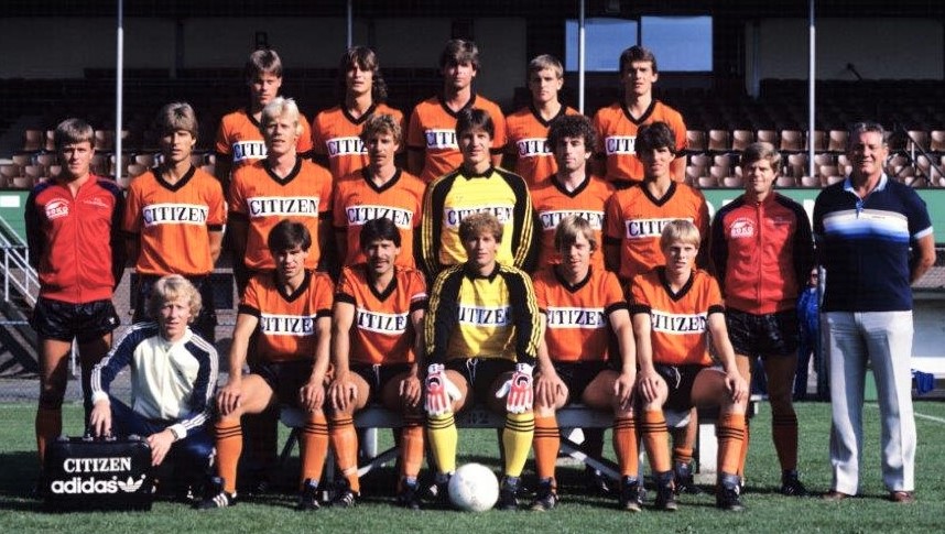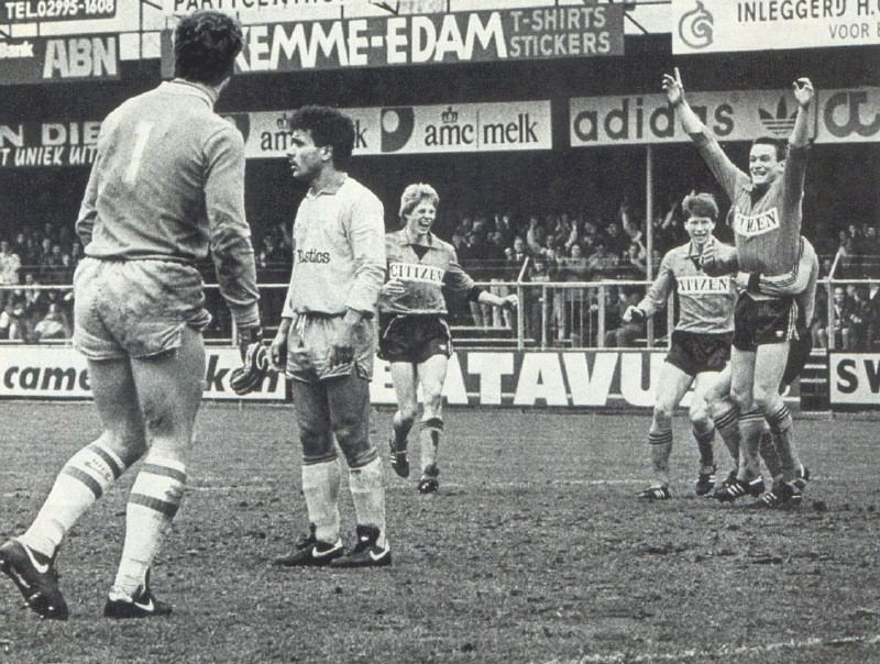 FC Volendam – DS’79 (2-0). Ton Blanker scoorde de openingsgoal met een halve omhaal. Johan Steur en Ab Plugboer juichen mee. FC Volendam bleef dat seizoen gehandhaafd in de Eredivisie.